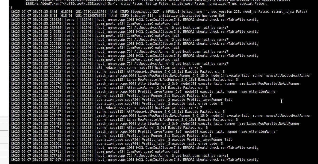 开启算子库日志(export ASDOPS_LOG_LEVEL=INFO; export ASDOPS_LOG_TO_STDOUT=1)与开启 ATB 日志(export ATB_LOG_LEVEL=INFO; export ATB_LOG_TO_STDOUT=1)多节点启动 service报HCCL问题,例如下图: