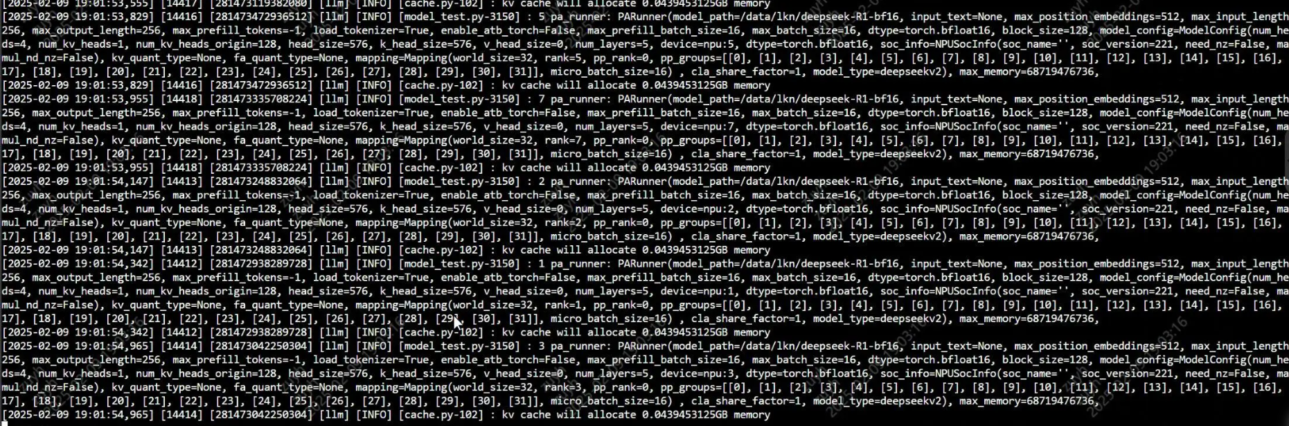 在拉起模型的过程中,会遇到各类不太明确根因的问题,如多节点拉起服务化\纯模型卡住、加载过程中报错、host 侧内存不足等问题。这类问题可能需要多次修改代码\环境变量,再拉起模型进行验证。拉起670B 的权重是一个特别耗时的过程,短的可能2、3 分钟,长的可能需要10、20 分钟。