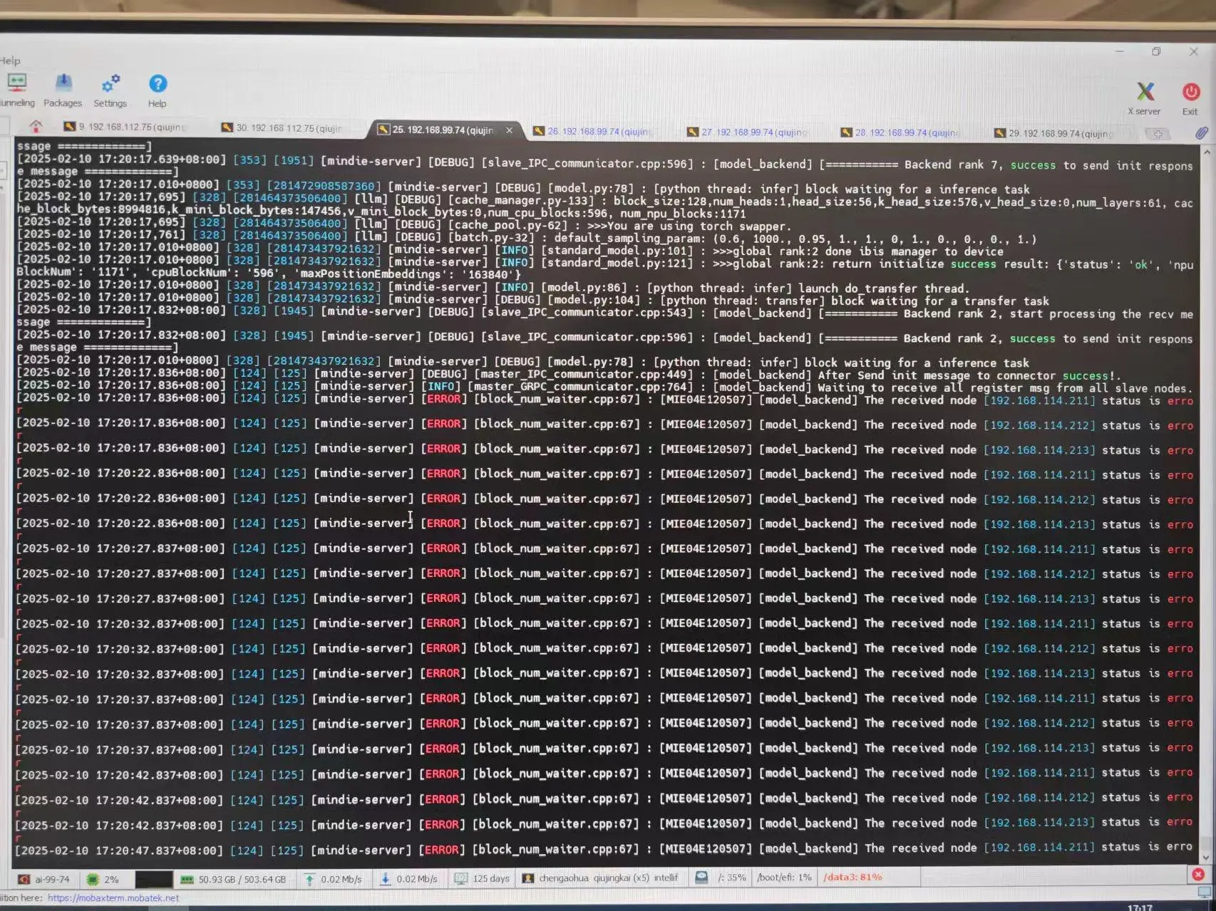 - 4 机推理,deepseek r1 服务化拉起失败,salve3 台服务化都能起,master 起服务会失败,报错信息如下图: