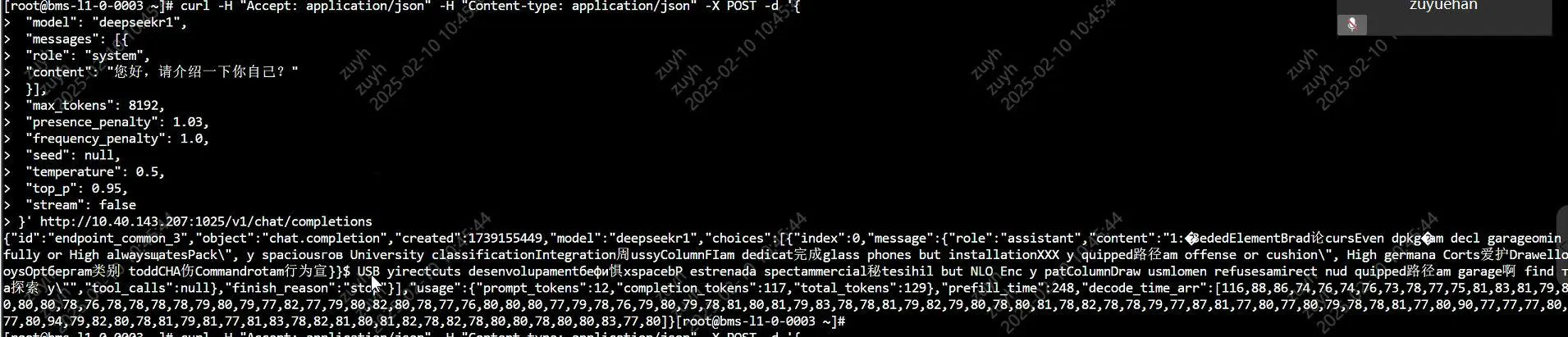 四机部署deepseekR1,启服务后,发送推理请求,返回内容乱码,没有报错,例如下图: